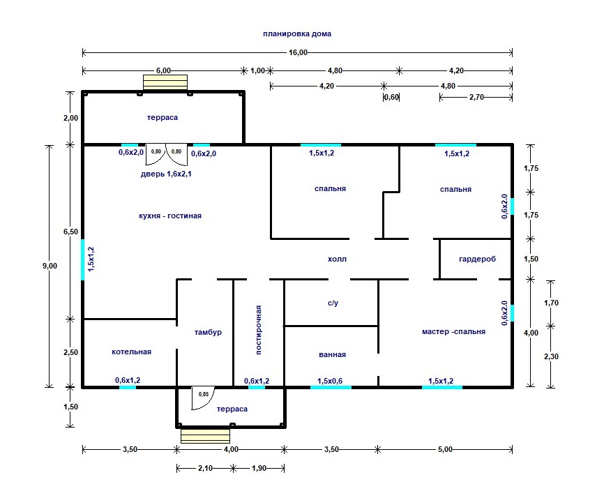 Дом 9,0х16,0м каркасный одноэтажный с двумя террасами.
