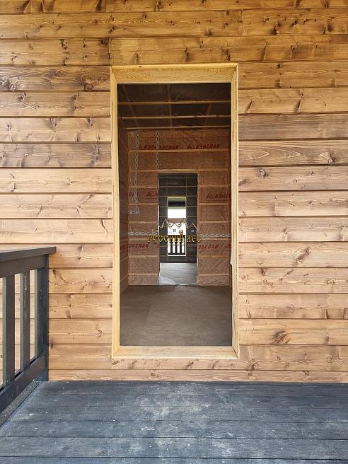 6. Заводская покраска дома снаружи, столбы, наличники, ограждения, террасная доска (1 слой грунт + 2 слоя покраска с ЛКМ Текнос), также упаковка, доставка на объект