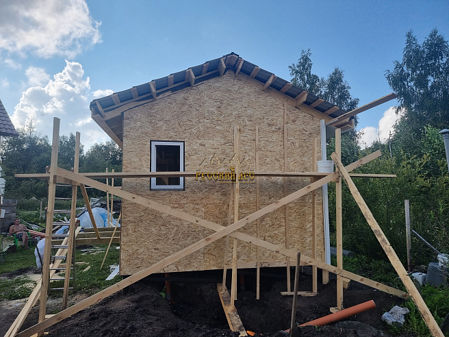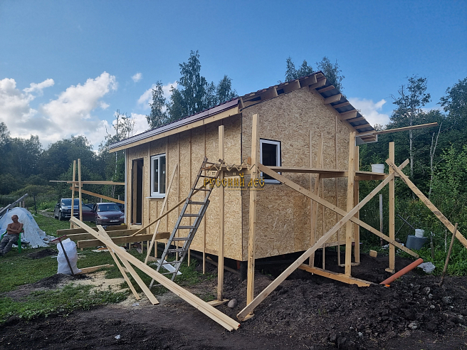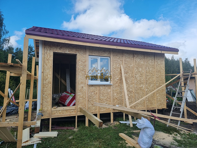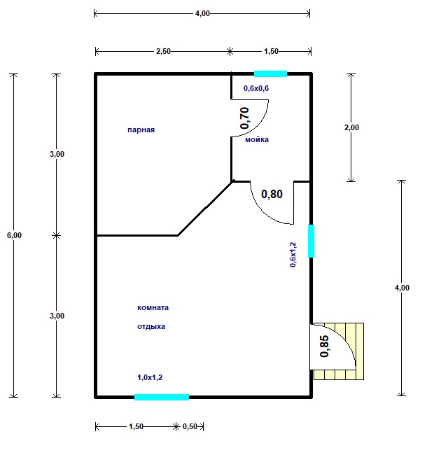 Баня 4,0 х 6,0м каркасная одноэтажная с двускатной крышей. Высота первого этажа –2,4м. Высота в коньке крыши – 1,0м. |