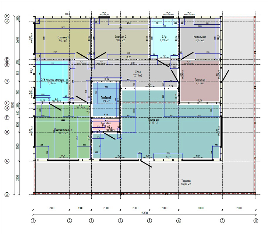 Дом общий размер 12,3х15,3м каркасный одноэтажный с Г-террасой под общей ПЛОСКОЙ крышей. Высота первого этажа –3,0м. Крыша – плоская (наплавляемая с наклоном). |