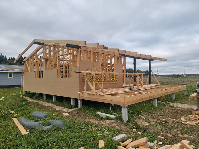 Дом общий размер 9,0х12,0м каркасный одноэтажный с террасой. Высота первого этажа –2,8м. Высота в коньке – 1,0м. Крыша – двухскатная. |