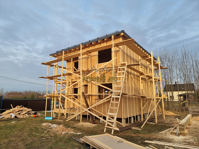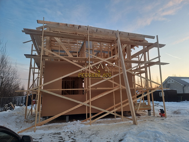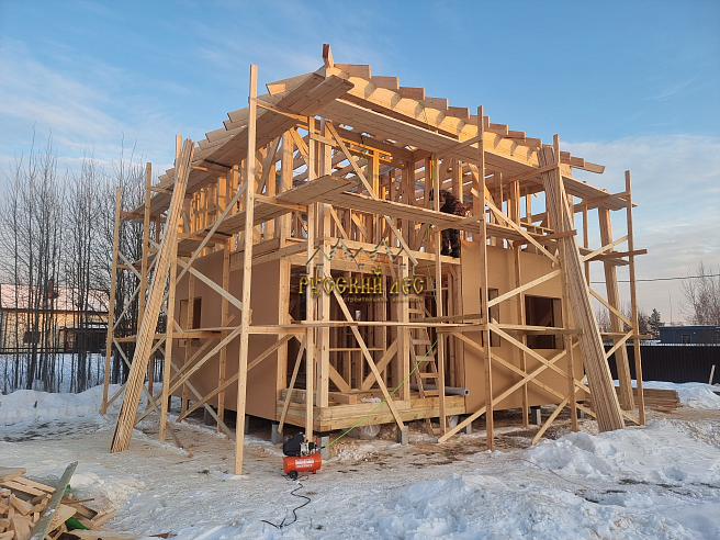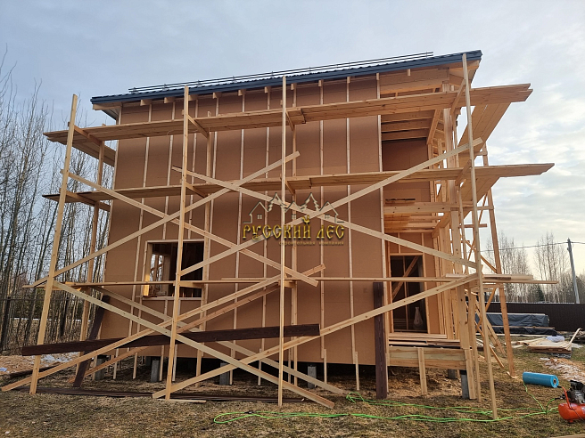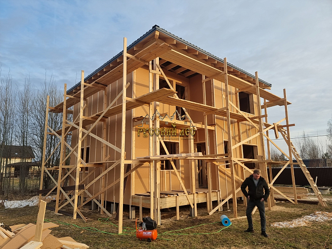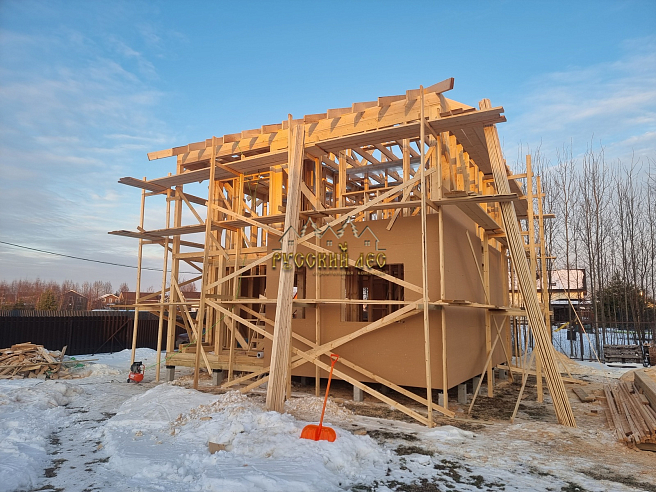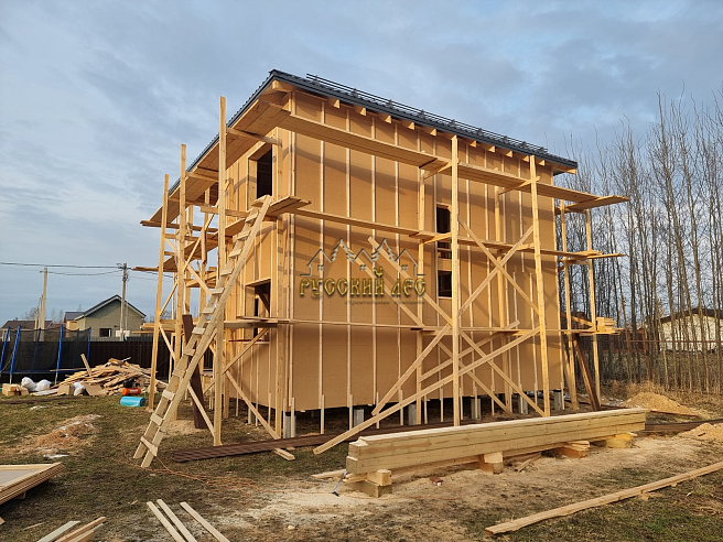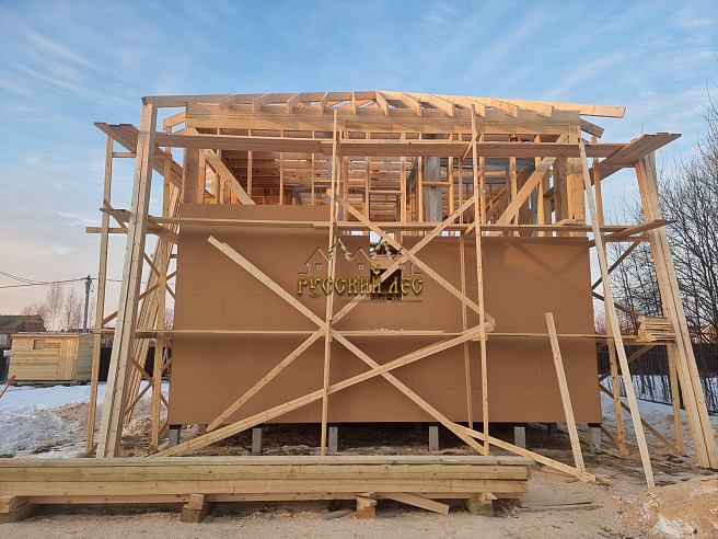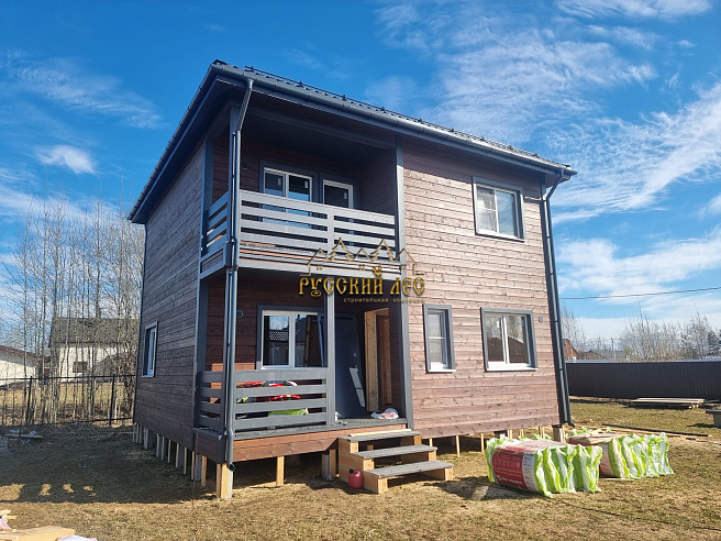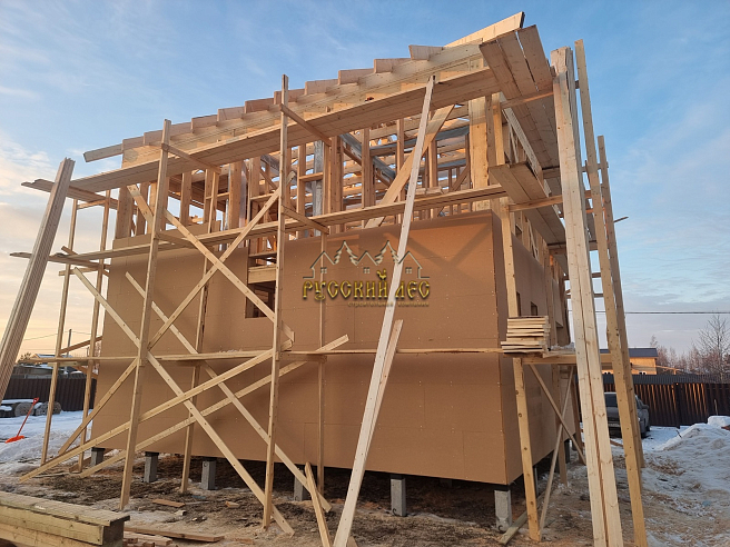 Дом 8*8м каркас в два этажа с террасой и балконом под общей вальмовой крышей. Высота первого этажа – 2,7м. Высота второго этажа – 2,5м. Высота в коньке – 2м. Крыша вальмовая (конверт). |