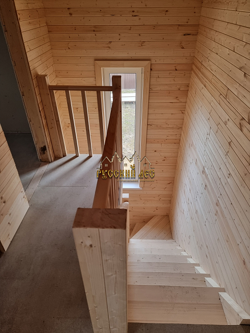 Деревянная двухмаршевая с перилами и круглыми балясинами. |