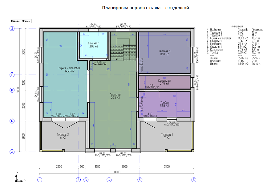 Толщина каркаса стен 1-ого и 1,5-го этажа (мм) |