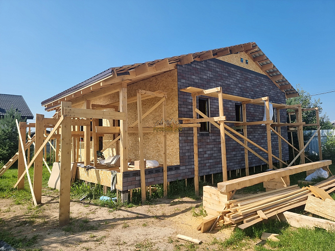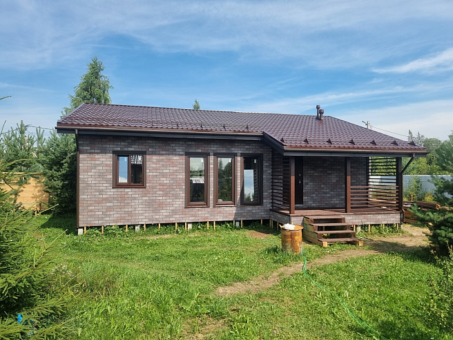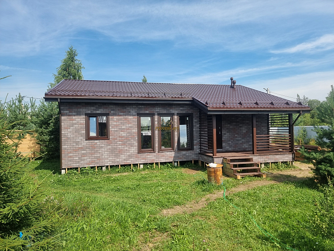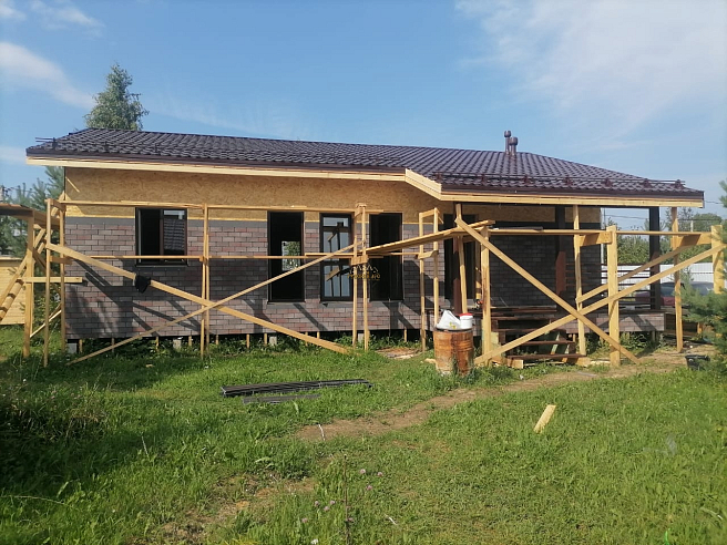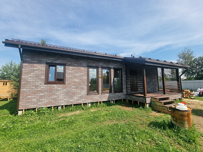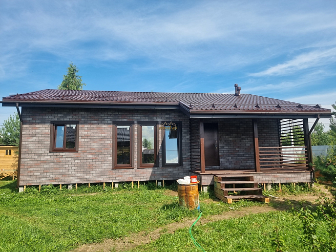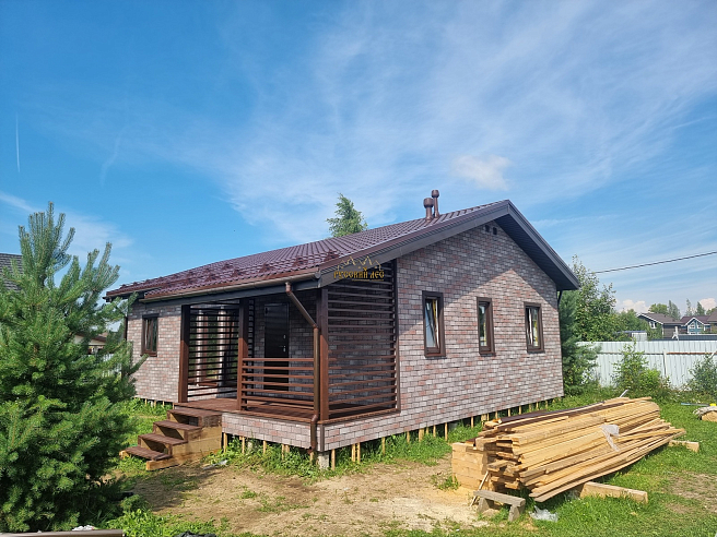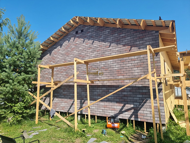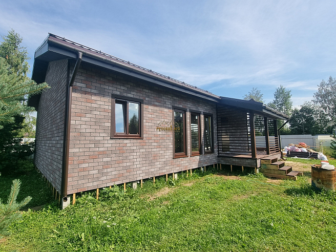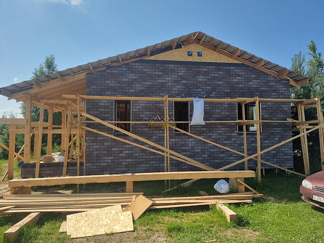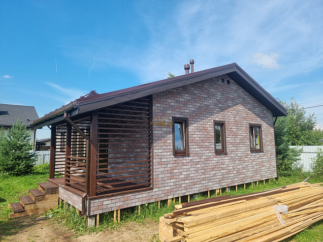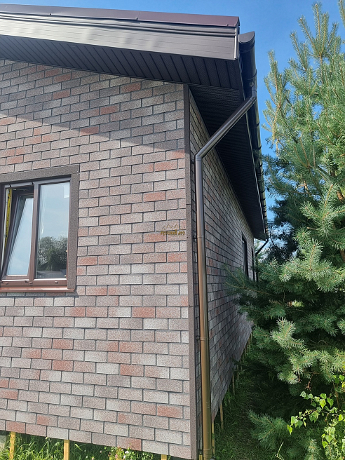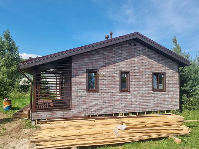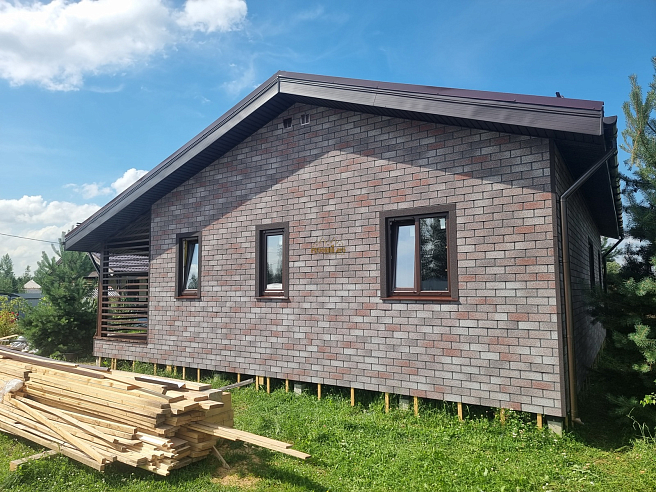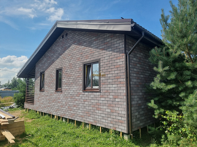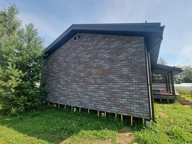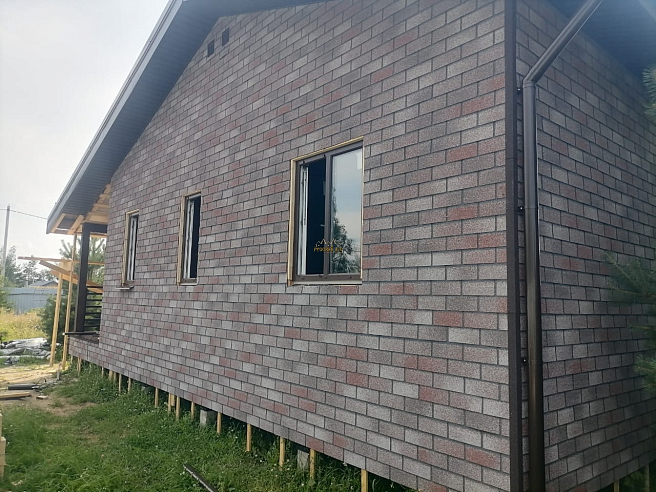 Фасадная плитка ТЕХНОНИКОЛЬ HAUBERK (цвет – мраморный кирпич) + плита ОСБ 9мм + контробрешётка брусок 20х45мм + плита Белтермо 20мм (шип-паз) |