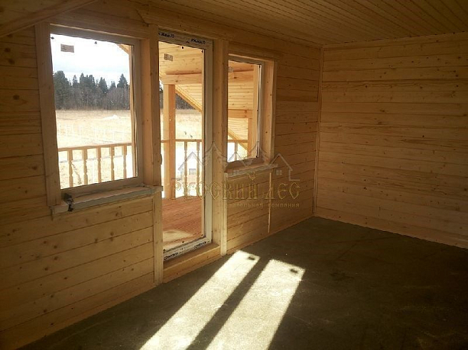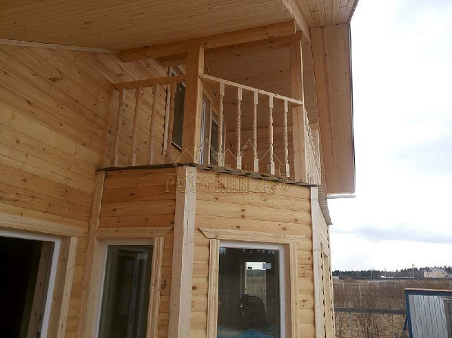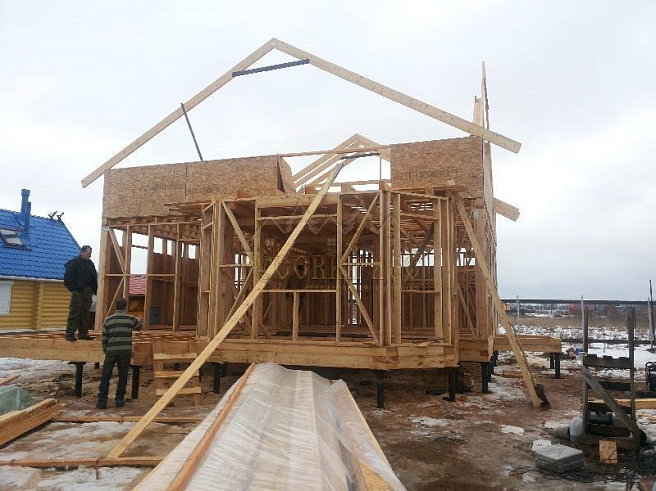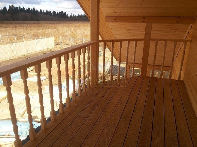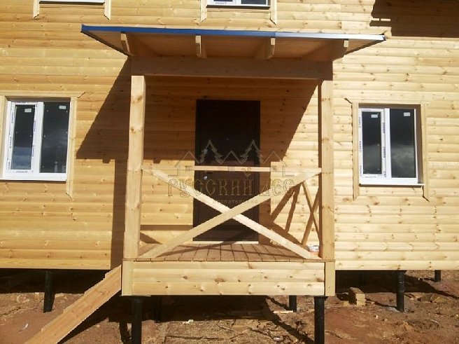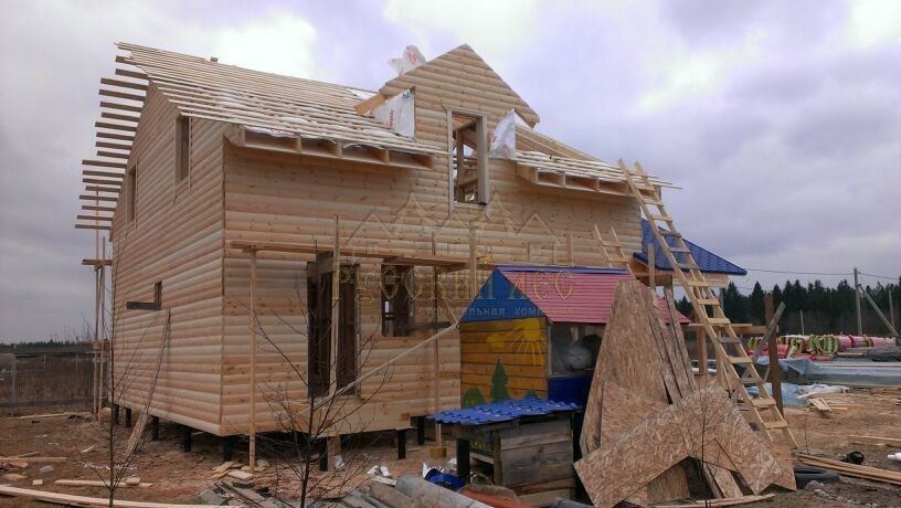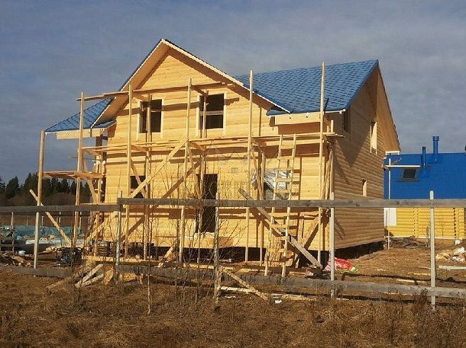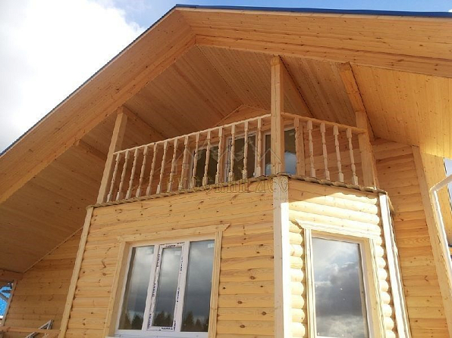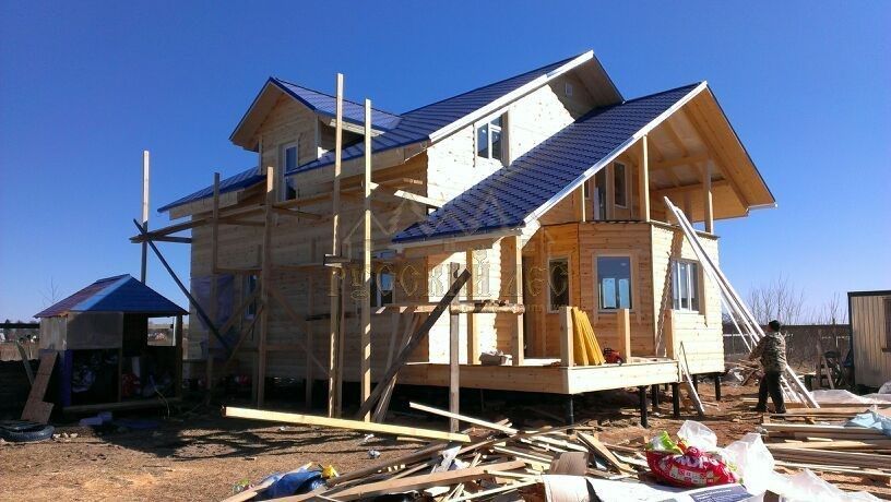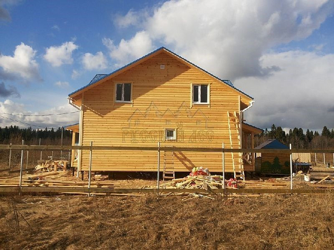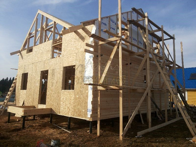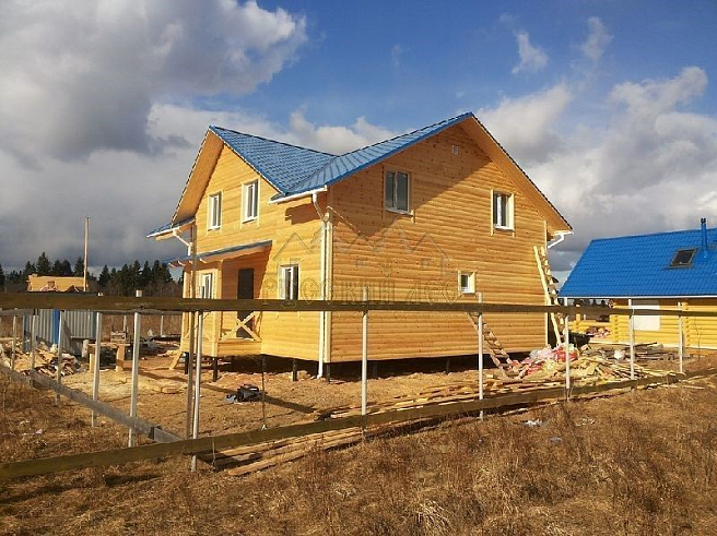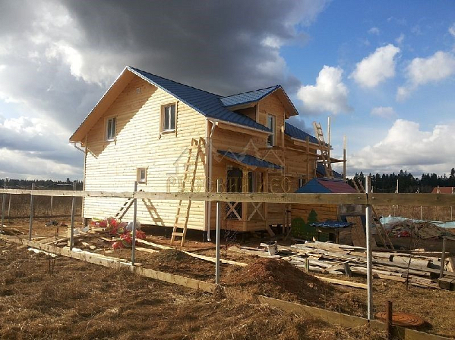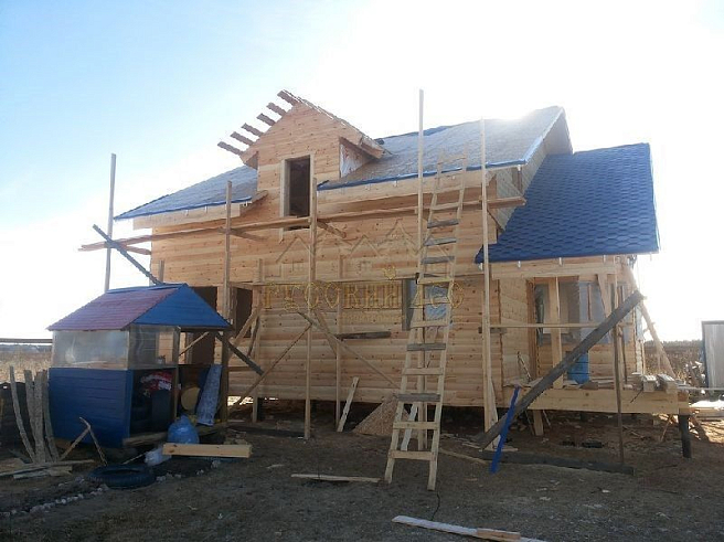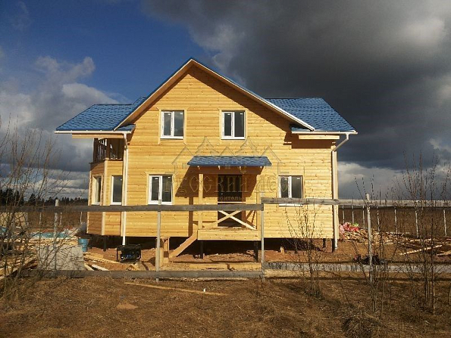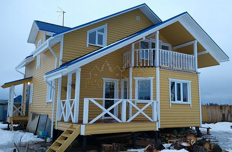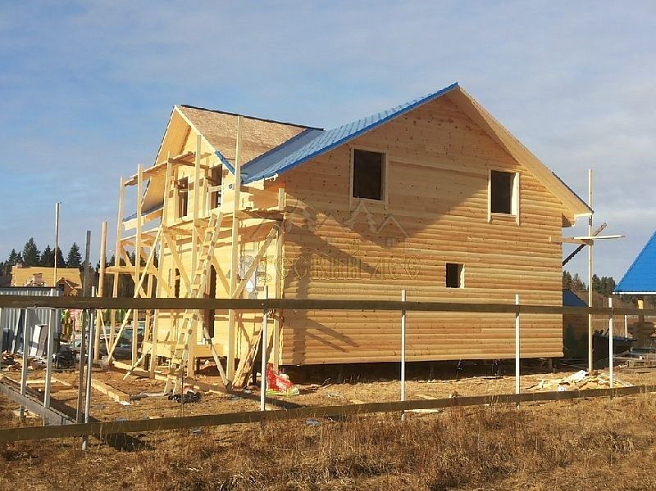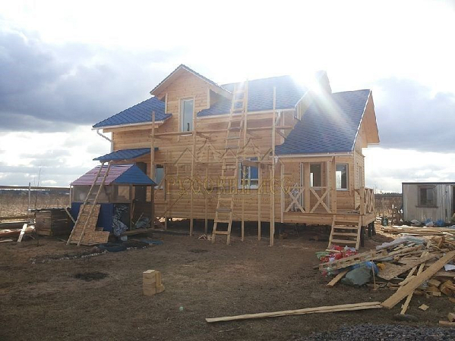 Подбирая проект дома нашему заказчику требовалось построить теплый и экологически чистый дом, чтобы он вписался в общую концепцию приусадебного участка. Технология строительства по которой строился дом - каркасная, т.е. будущий дом будет выполнен из современных экологически чистых материалов, который будет "дышать" и сохранять тепло долгое время, снижая тем самым затраты на отопление. Снаружи дом обшивался имитацией бревна, чтобы добиться максимальной идентичности с рядом возведенной баней из бревна. Внешний контур стен изолирован теплоизоляцией толщиной 150мм, пола и кровли 200мм. Внешней отличительной особенностью этого проекта, можно считать интересную архитектуру кровли которая расположена над террасой и балконом. Жилая площадь дома 180кв.м. разделение пространства подбиралось исходя из потребностей заказчика. Как только наступит теплая погода, будет произведена обработка дома декоративно-защитным составом и будут выполняться работы по прокладке инженерных коммуникаций. Срок строительства данного дома составил 60 дней. Фундамент - винтовые сваи с обвязкой швеллером.